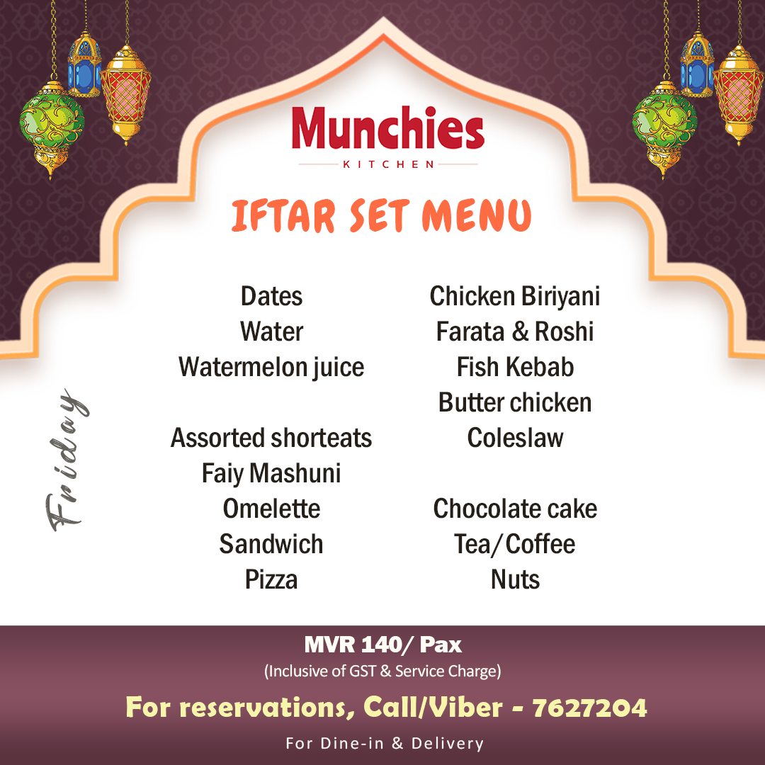 - MVR 140/Pax (Inclusive of GST & Service Charge)